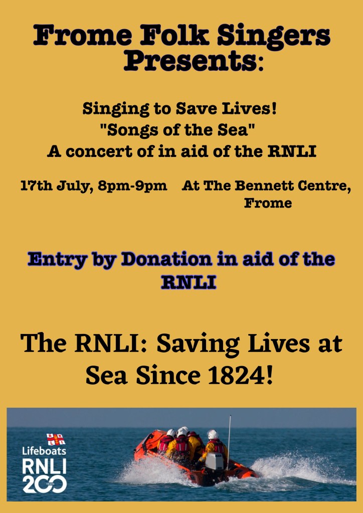 In the Summer term of 2024, Frome Folk Singers sang songs of the sea, sea shanties and traditional folk songs from the British Isles at a concert to support the RNLI “Sing to Save Lives” project to celebrate their bicentenary. The generous people of Frome donated £505 at the concert for the RNLI!