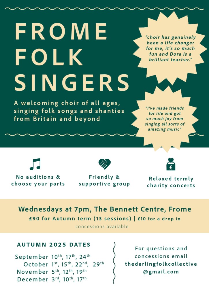 Dora is offering two singing workshops at the Bishop’s Palace in Wells this year; Sea Shanty’s in Harmony on Saturday 17th June, and Folk Carols in Harmony on Saturday December 9th. Bookings through The Bishop’s Palace.